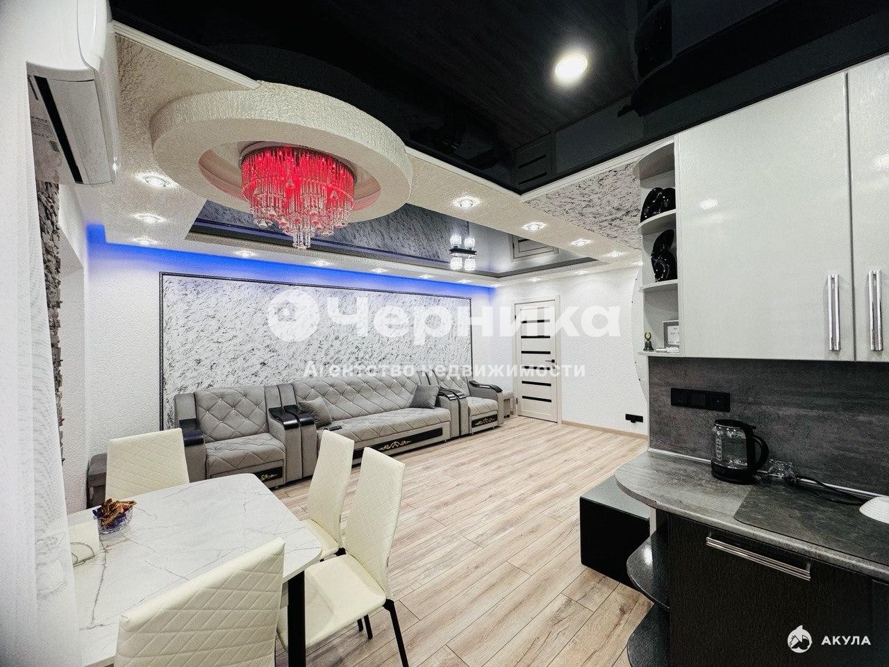 Выполнен качественный ремонт: напольное покрытие высокопрочный ламинат и плитка, фактурные краска и обои на стенах, натяжные потолки с красивыми люстрами и с цветными подсветками, современные межкомнатная и входная двери.
